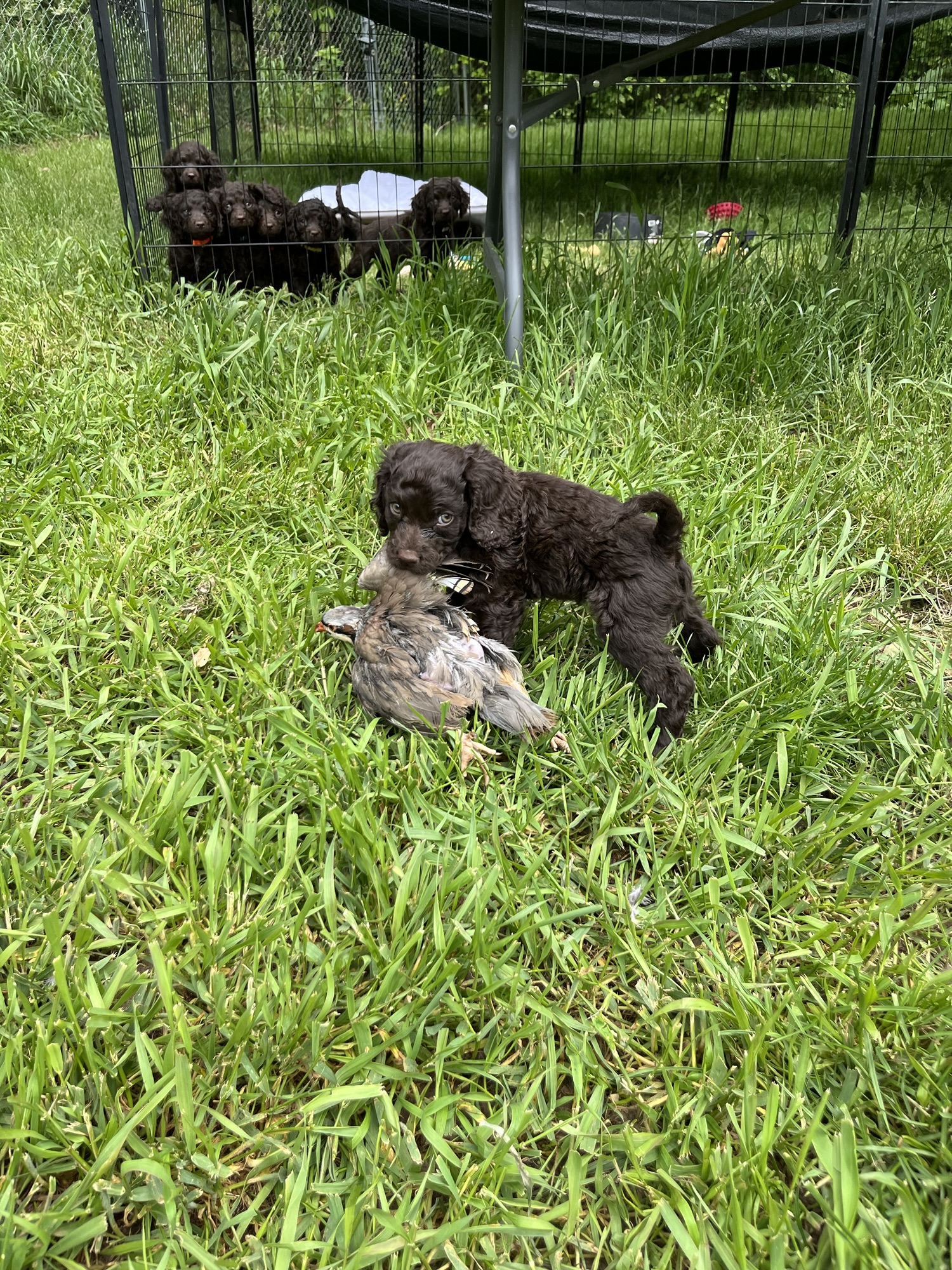 Our dogs actively train with the Great Lakes American Water Spaniel Club. Each of them routinely use & advance their skills in field retrieving drills, flushing, water retrieves, & obedience.